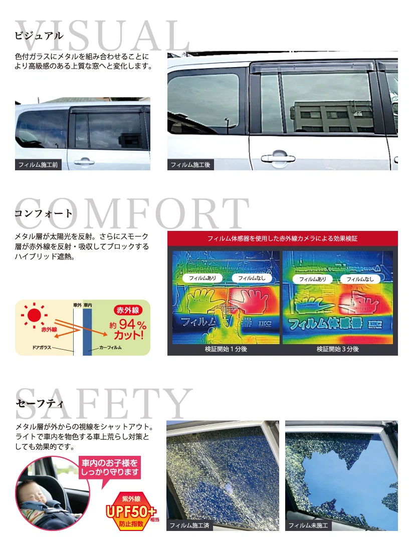 ●可視光線透過率70%以上の車検基準に適合しないため、自動車のフロントガラス・フロントサイドガラスにはご使用いただけません。